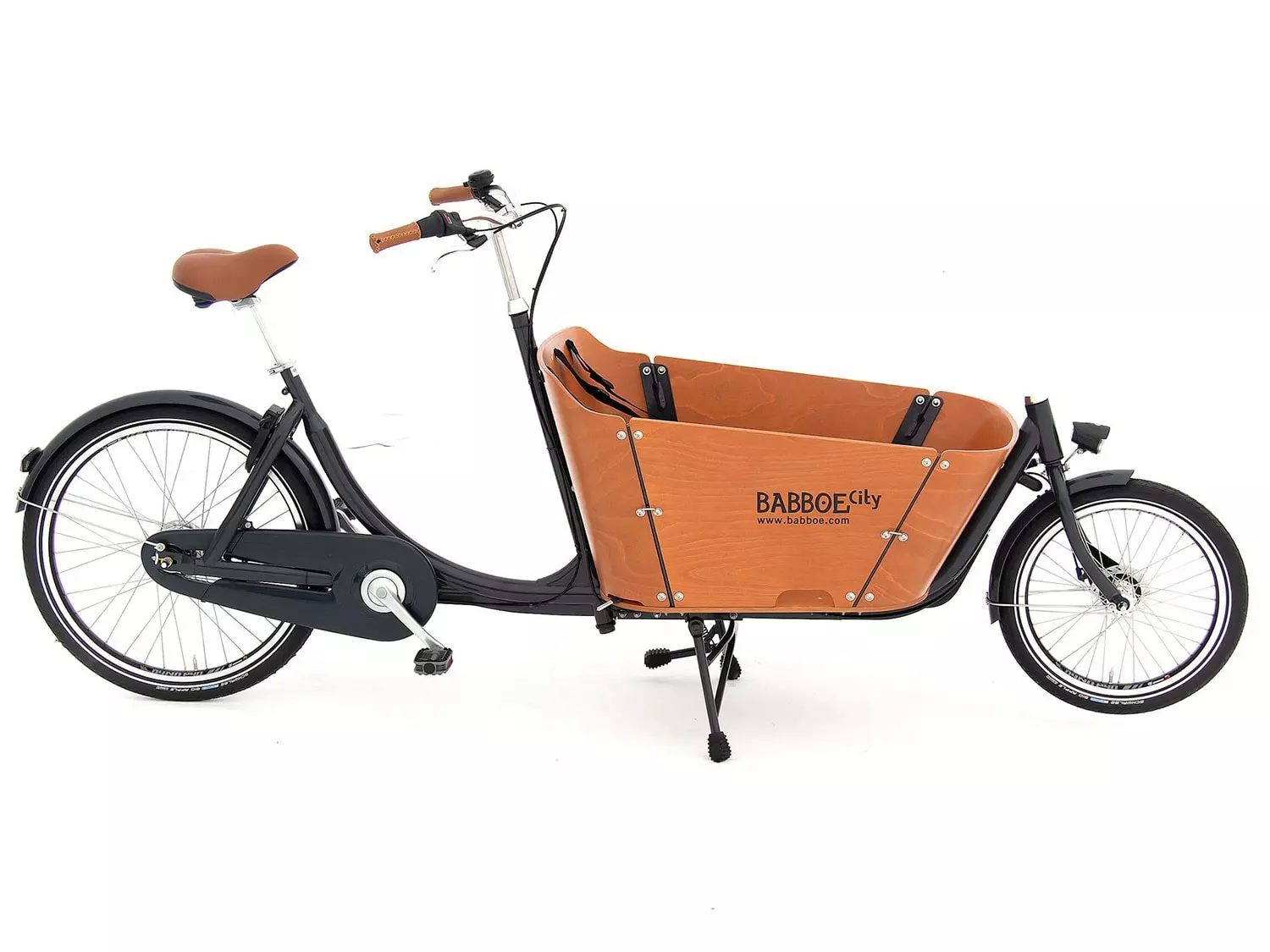 Das Babboe City ist ein elegantes Lastenfahrrad mit zwei Rädern.