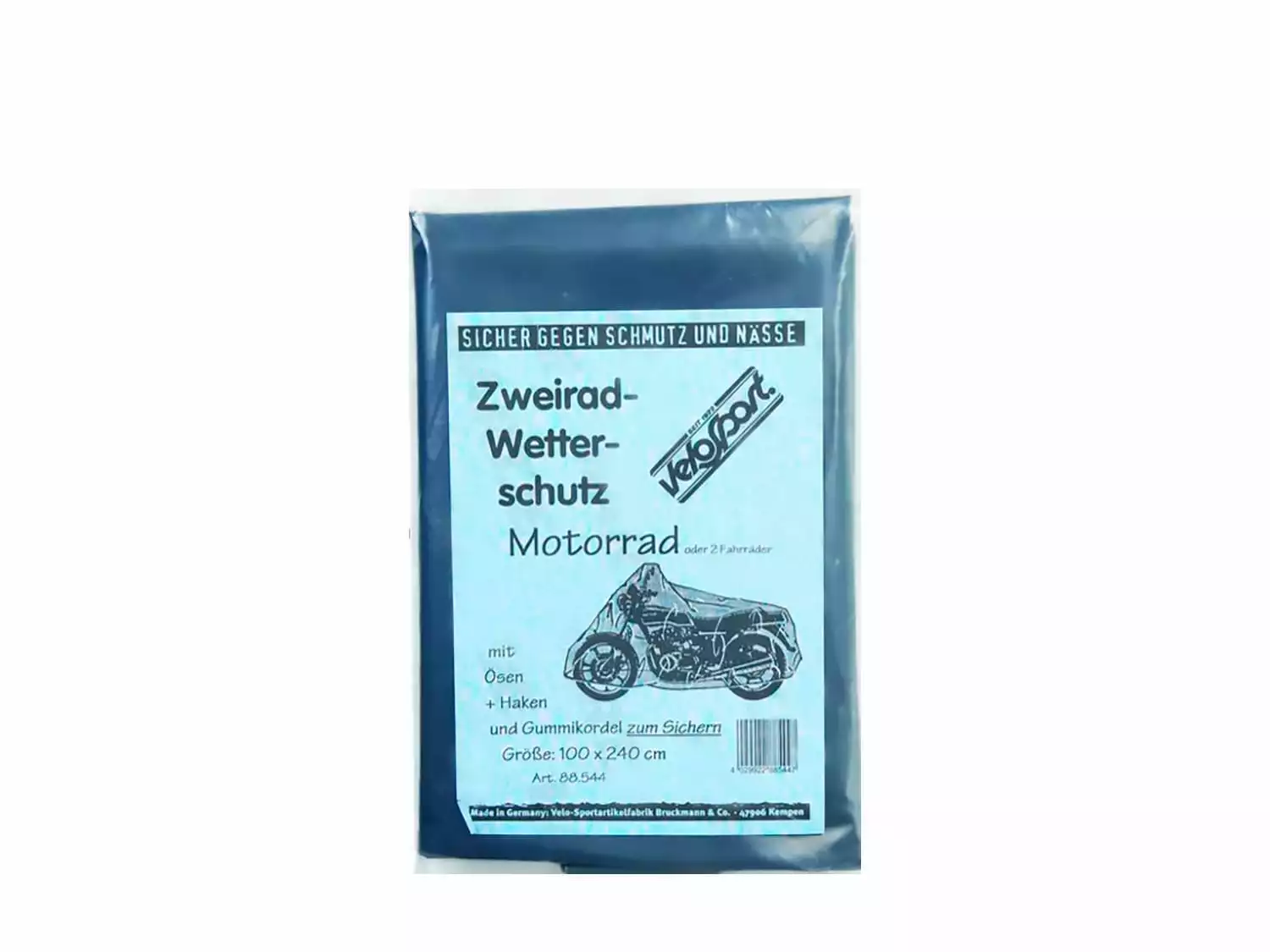 Mit der Velosport Zweirad-Wetterschutzhülle sichern Sie ein Motorrad oder bis zu 2 Fahrräder gegen Schmutz, Nässe und Sonneneinstrahlung. Ideal zur kalten Jahreszeit. Mit Ösen, Haken und Gummikordeln zum Sichern. Ca. 240x100cm.